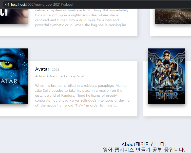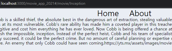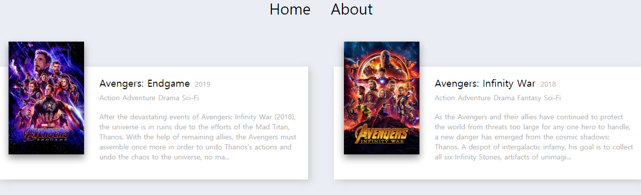- 이전 시간까지 만든 영화 페이지를 Home 탭에, 사이트를 소개하는 내용을 About 탭에 만드는 것이 목적이다.