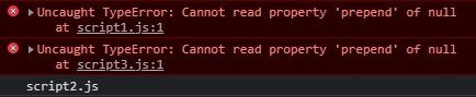 script1.js 와 script3.js 는 body가 생성되기 전에 실행되기 때문에 에러가 발생한다.