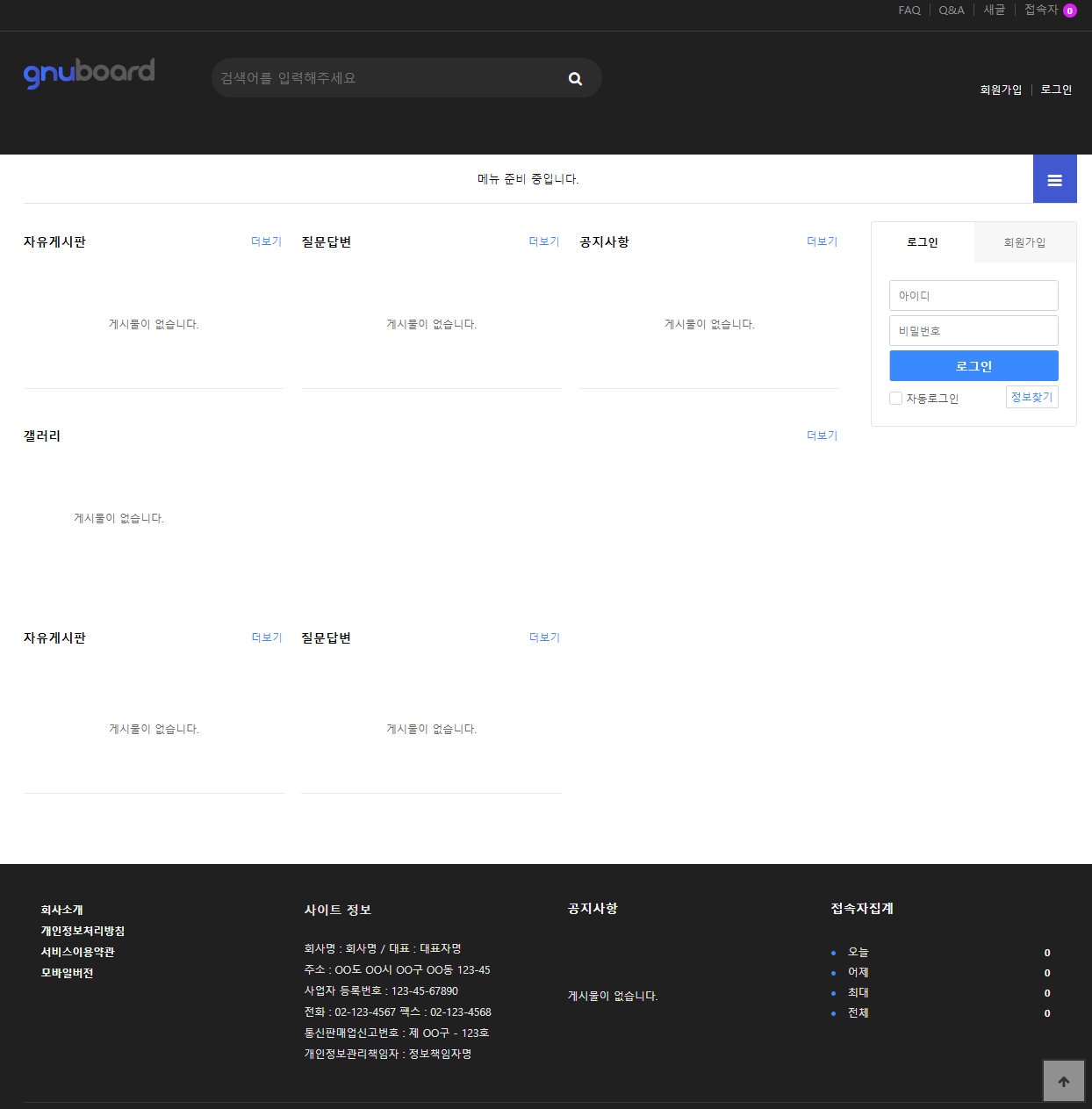 여기까지 작업하고 그누보드 사이트를 새로고침해보면 다음과 같이 헤더와 푸터가 제거된다.