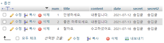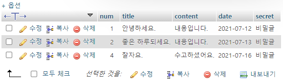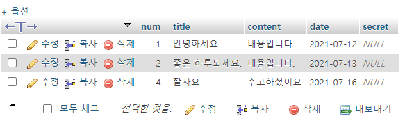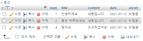 이전 시간에는 phpmyadmin으로 4개의 컬럼(num title, content, date)을 추가했다.