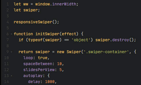 당연하게도 swiper는 initSwiper() 함수 안에 정의되어 있고 이것은 지역 스코프로써