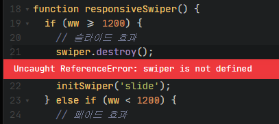 이 역시 swiper를 초기화 하기 전에 먼저 swiper.destroy()를 사용해서 에러가 발생했다.