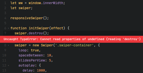 변수를 미리 선언하더라도 아직 swiper를 초기화하지 않은 것은 마찬가지이므로 에러가 발생한다.