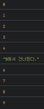 실행된 코드를 보면, i가 5일 때, console.log(i)가 실행되지 않고 건너 뛴 것을 확인할 수 있다.