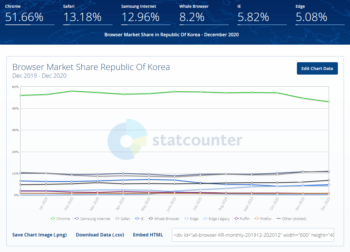 우리나라의 익스플로러 점유율이 2019년 10퍼센트에서 2020년 5퍼센트로 떨어졌다고는 하지만 회사와 클라이언트 입장에서 익스플로러를 완전히 배제할 수 없는 상황이다.