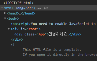 <div className="App"> </div>사이에 내용을 입력하면 개발자도구 #root > .App 에 입력된다.