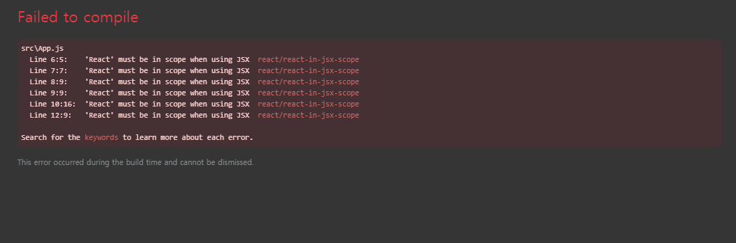 - 그랬더니 이번에는 인터넷 브라우저로 React가 실행되긴 하지만 새로운 오류가 떴다.